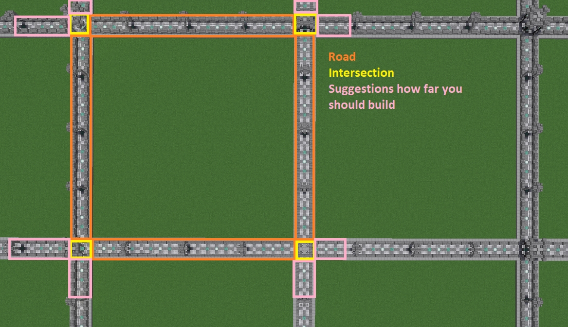First, you want to build a road surrounding your plot. The road includes the walls, the plot border and the full intersection. Therefore, you have to build over the intersections as well, we recommend going 3 or 4 blocks ahead.